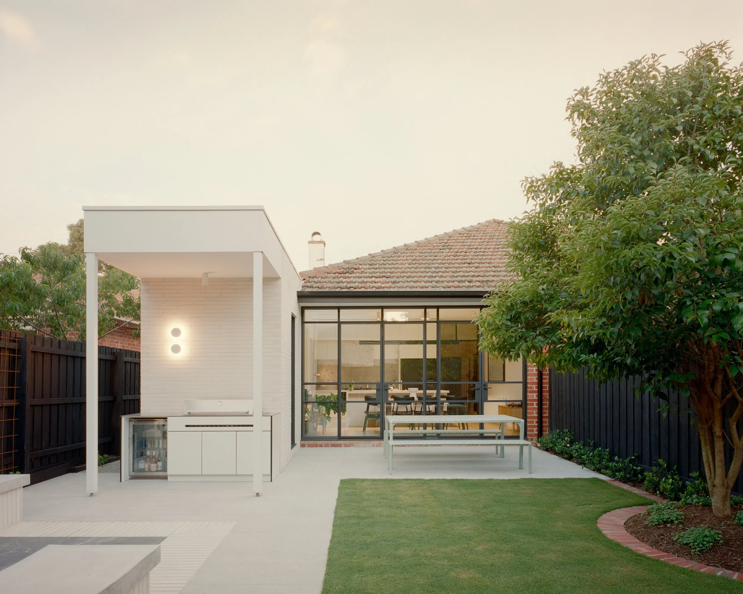 Within this arrangement, a formal European garden presents itself. Low planting traces new looser geometries, while a semi-circular concrete seat keys into the axis of the composition. The curve is not ornamental, it is infrastructural, anchoring the garden to the mass behind it. One senses in its arc the echo of amphitheatre steps.